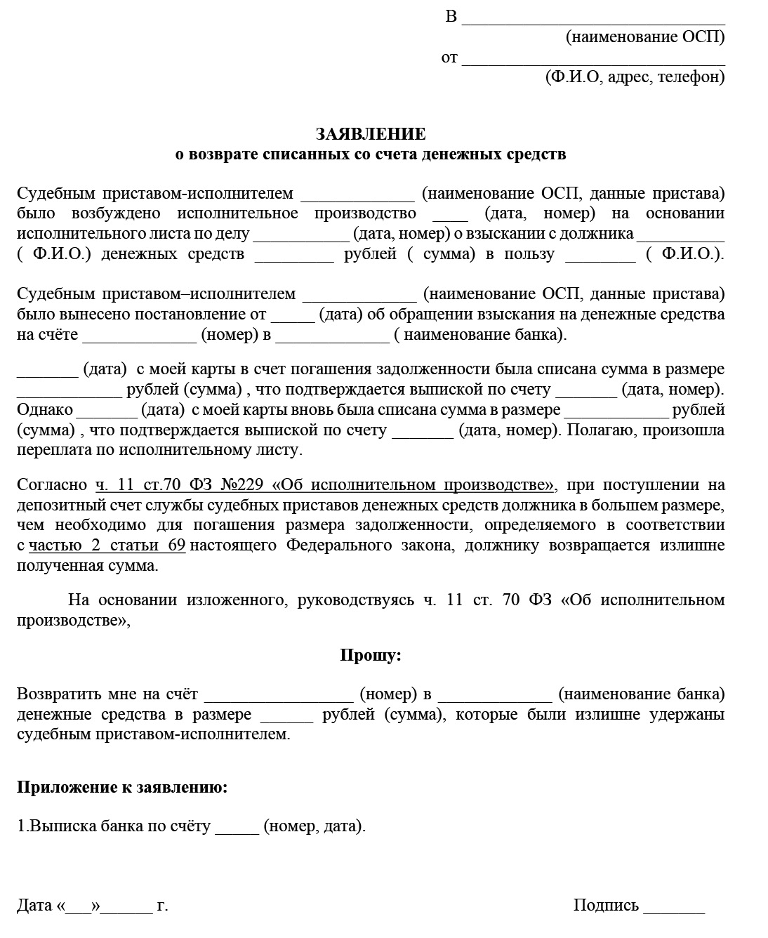 - Написать заявление приставу о том, что сумма списания превышает размер долга, и «излишек» необходимо вернуть.