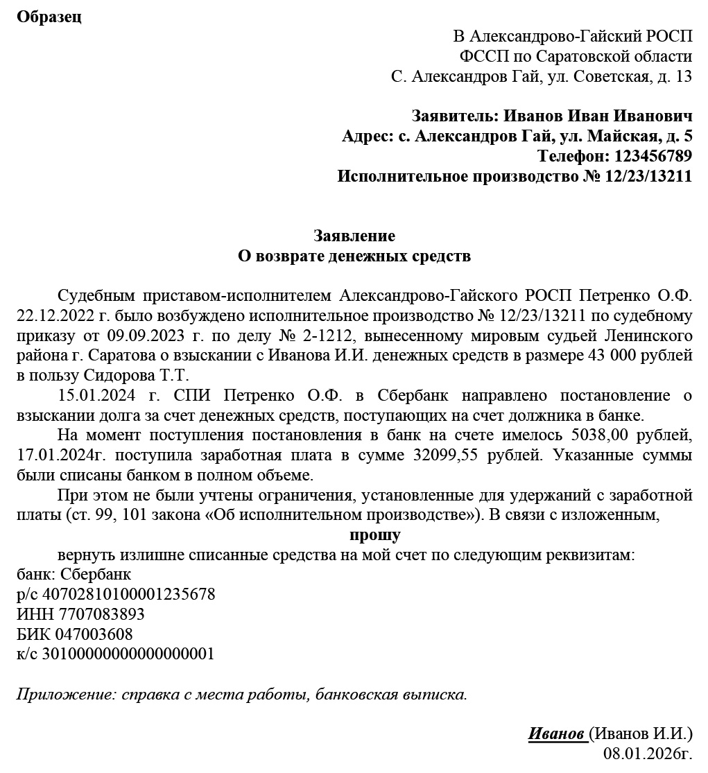 Закон допускает взыскание только в пределах суммы долга, поэтому все излишне взысканные средства подлежат возврату. Если с должника незаконно удержали лишнее, необходимо отстаивать свои права: подать заявление судебному приставу, предварительно зафиксировав нарушение (сгодятся выписки со счета) и добиться возврата. Чем быстрее начаты действия, тем выше шанс вернуть деньги без суда, поскольку после удержания сумма какое-то время хранится на депозитном счете ФССП и только потом переводится взыскателю.